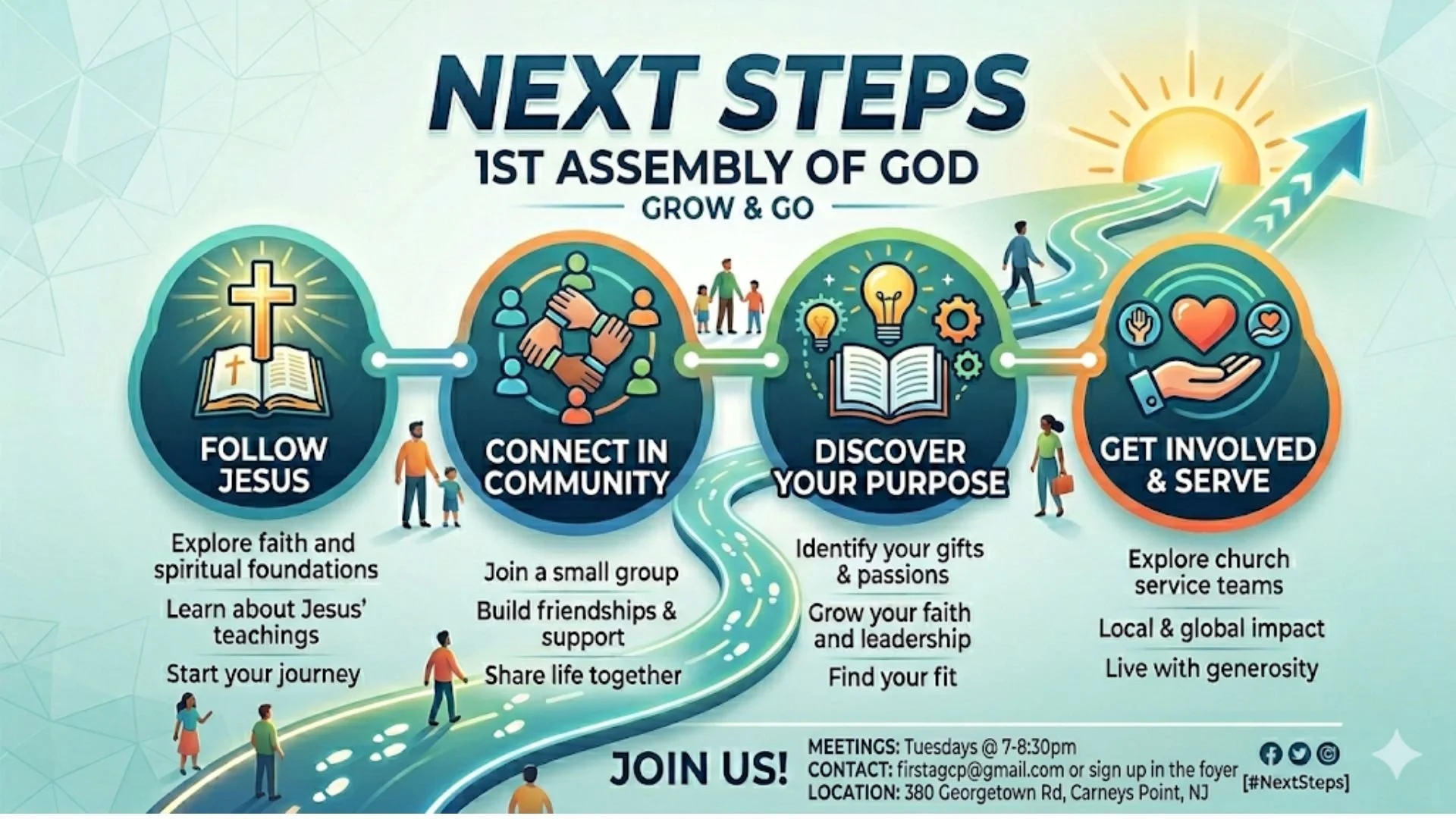 Thank you for taking the time to check out First Assembly of God, Carney’s Point. We are excited that you are thinking about visiting with us. Please take a moment and click the “New Here” tab at the top of the page for a greeting from Pastor Aj. Also, you can click the Social Media icons at the bottom of the page to check out our posts, encouragements, announcements, and view previous services. We look forward to seeing you this Sunday.
